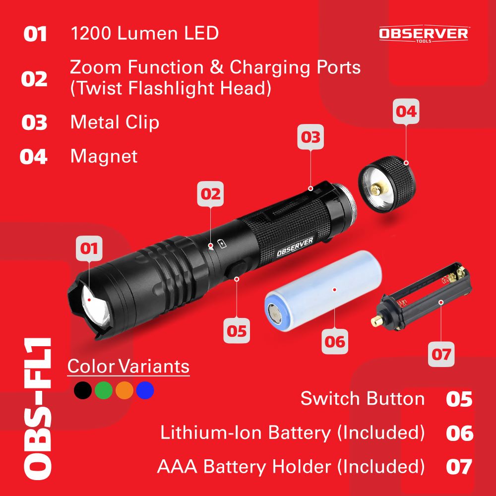 Observer Tools Bundle 1200 Lumen Tactical LED Rechargeable Flashlight X3