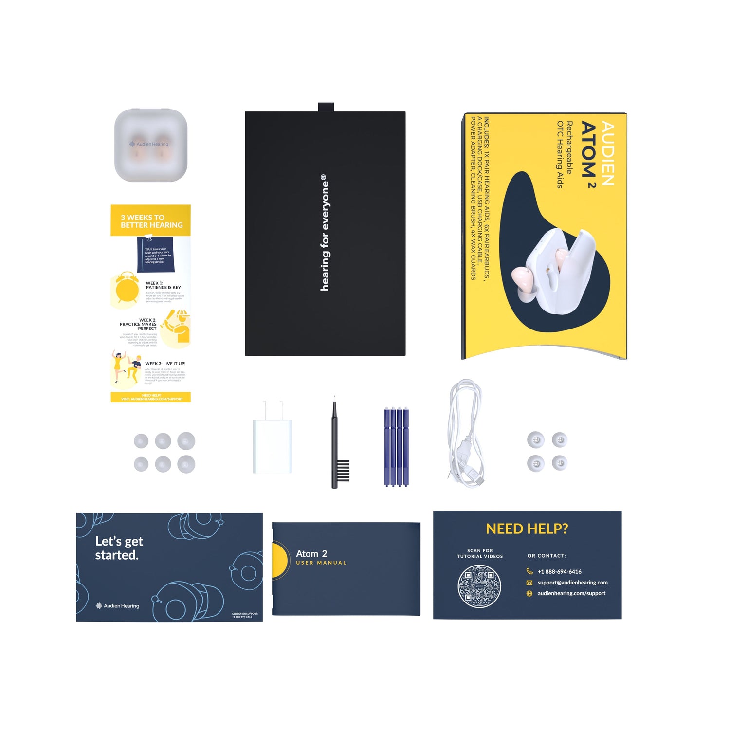 The Audien Atom 2 is one of the most effective OTC hearing aids on the market. By cutting out the middlemen, sales reps, and audiologists, Audien delivers a hearing aid similar to those that cost thousands for a fraction of the price. The Atom 2 does not require a hearing test and can be used out of the box in just a few minutes. This hearing aid has superior sound, so you don't miss out on conversations with friends and family. It is rechargeable, has 4 hearing modes, and is nearly invisible when worn. Beige color. Easy to use and convenient. Audien Hearing aids offer superior sound. No more missing out on conversations with friends and family. Audien devices amplify speech while reducing background noise, making it easier and more comfortable for you to hear noisy settings. The sound quality is consistent, long lasting, and crisp, with almost zero whistling or feedback.