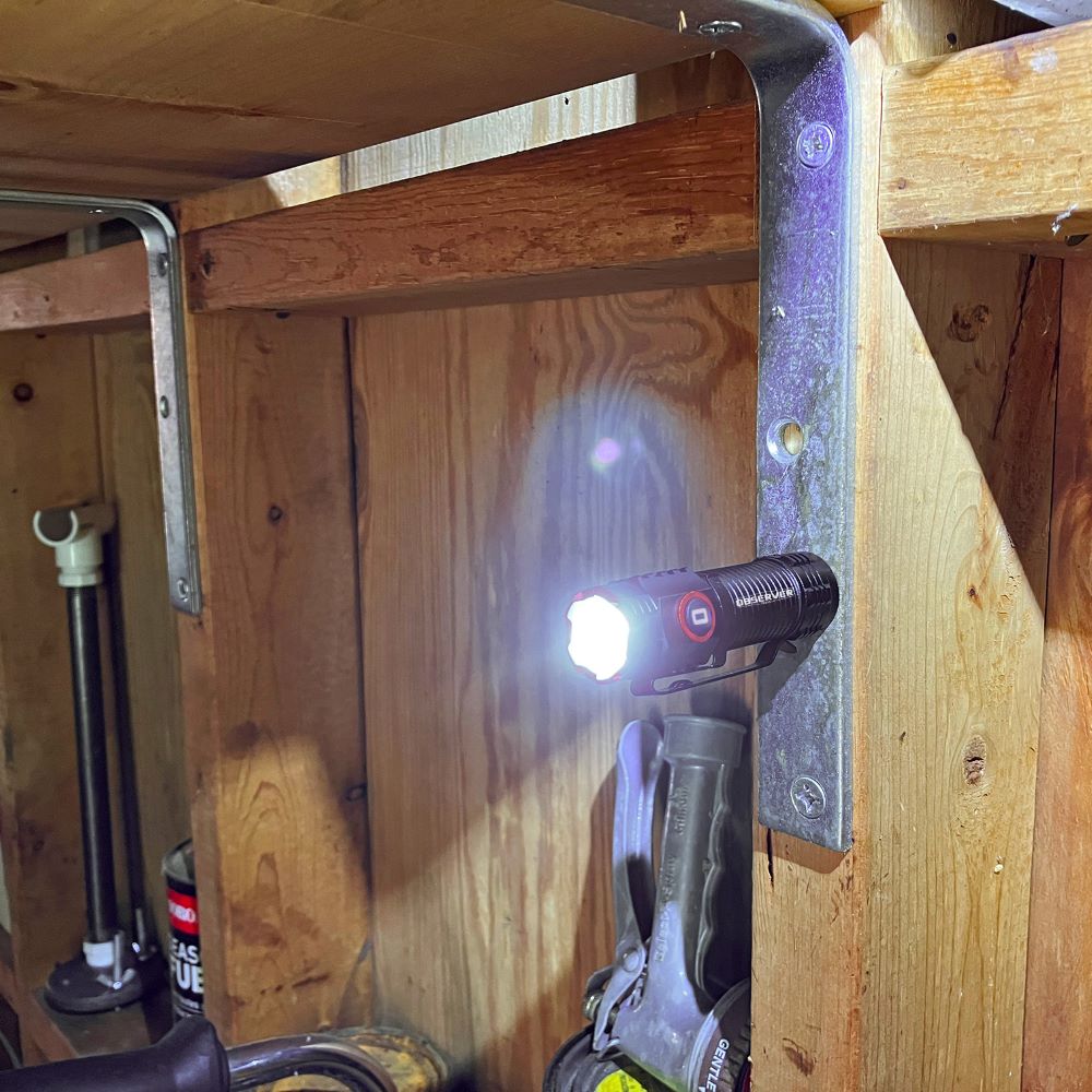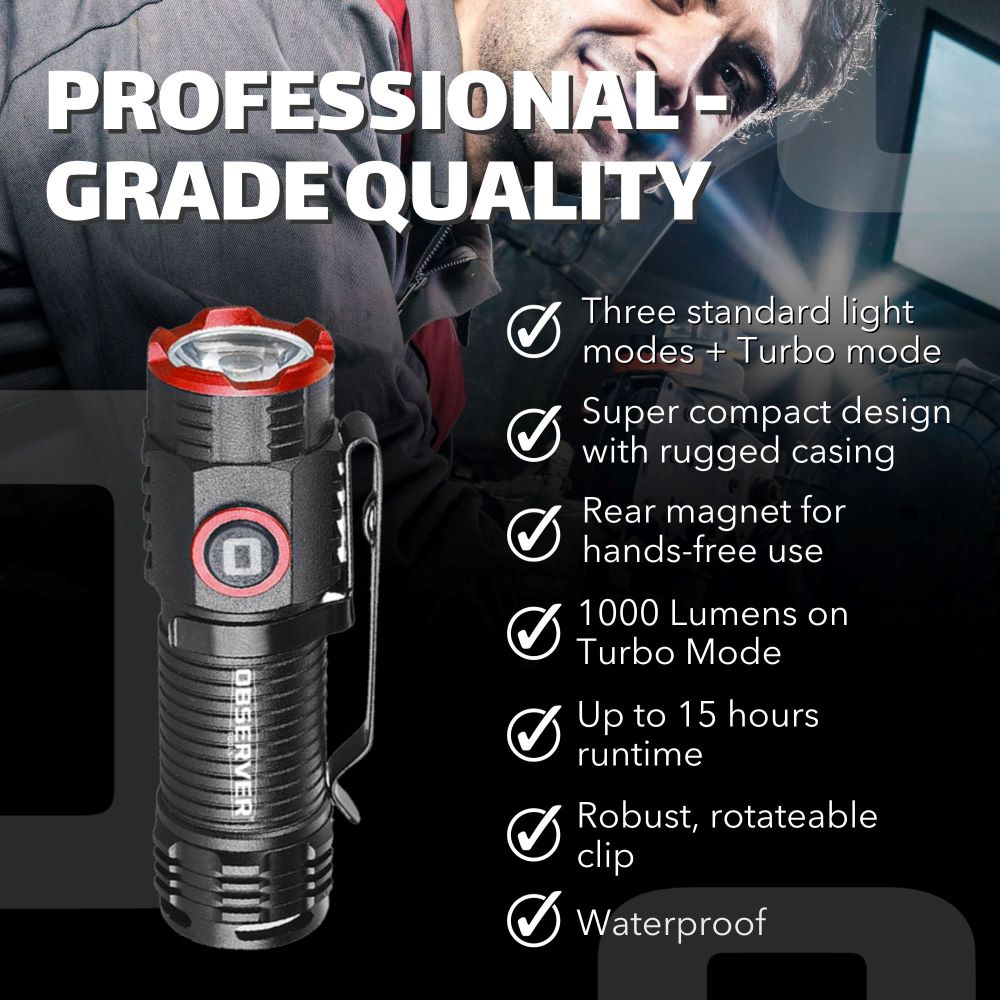 - X-Factor: This rechargeable mini flashlight from Observer Tools is a true, full-featured pro-grade light and mighty bright: 1000 Lumen Turbo Mode, Rechargeable, up to 16h Runtime, Rear Magnet, Clip. At under 3 inches, it packs away easily around the house for when you need it and is great on the go.
